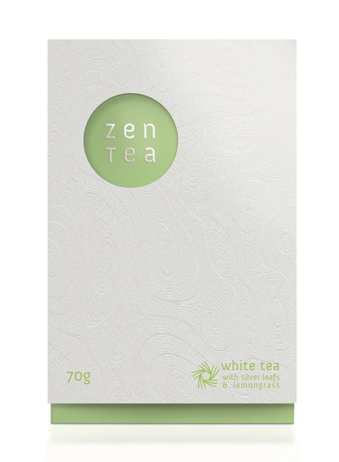 看看這美麗的茶包裝。我們喜歡在外套筒上的一個禪宗花園的微妙質地。一旦撕開它,你看到一個散熱墊模式從標志類型。色彩柔和的調色板反映了設計師想要傳達的寧靜。