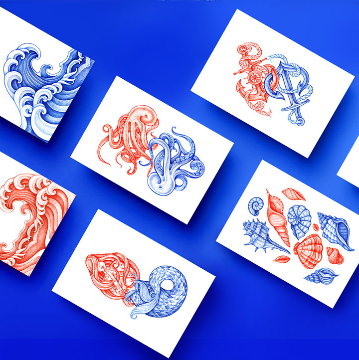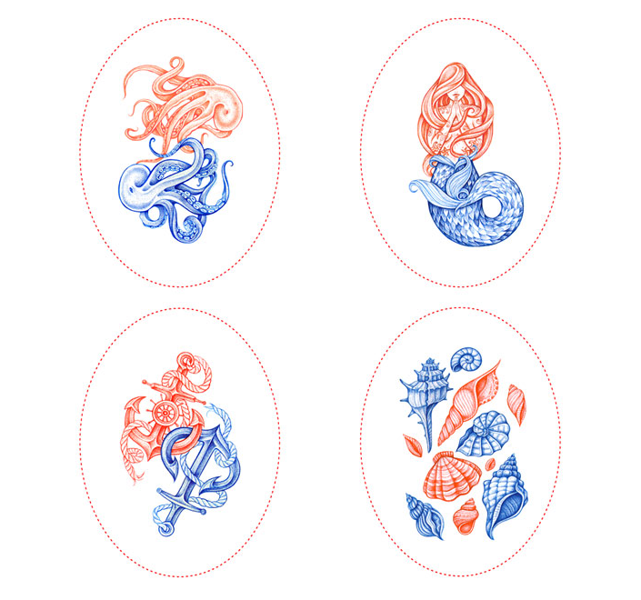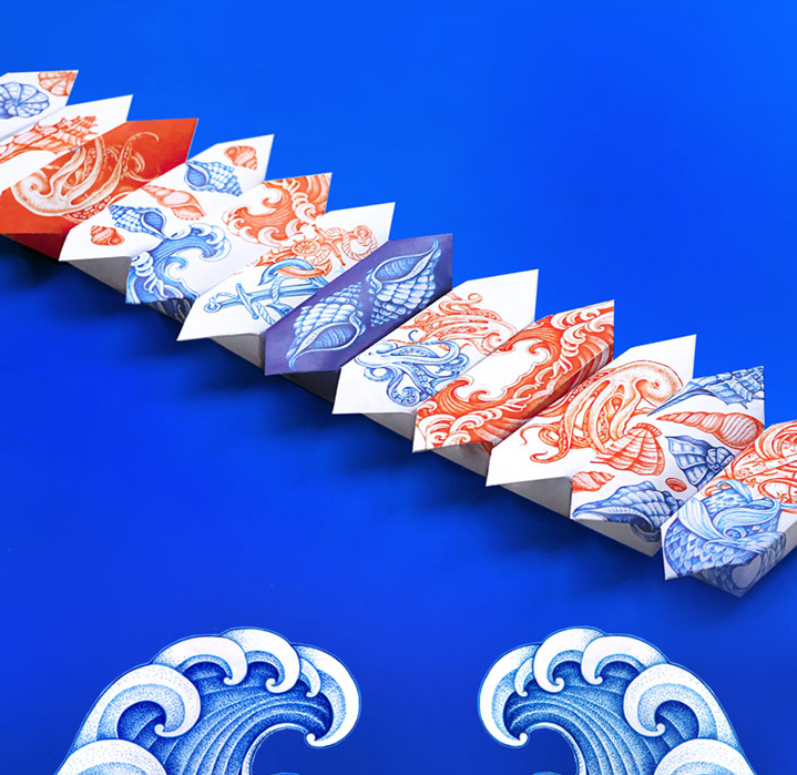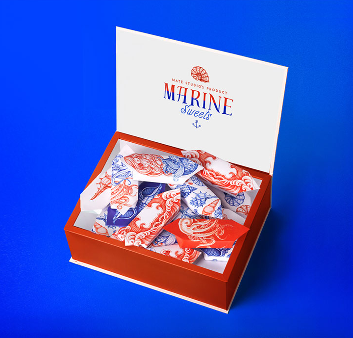 這條由伴侶工作室設(shè)計(jì)的糖果制作精美,在一個(gè)干凈的白色表面上使用華麗的紅色和藍(lán)色的插圖。圖紙是復(fù)雜的,優(yōu)雅的手繪線的組合收斂。美麗的海上圖案被翻譯在外包裝上,并在個(gè)別包裝上,每一個(gè)甜蜜的折疊在一個(gè)豐富多彩的封面。